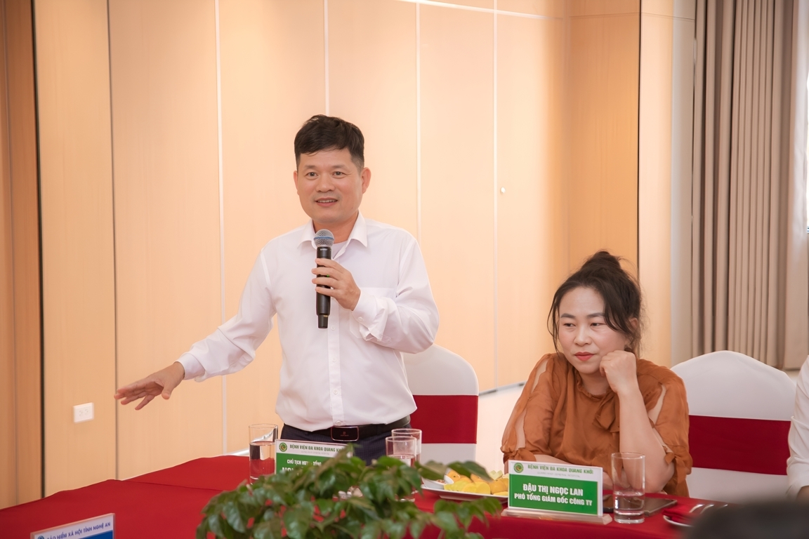 Ông Nguyễn Văn Khởi - Chủ tịch HĐTV kiêm Tổng Giám đốc Bệnh viện chia sẻ định hướng phát triển của Khu phức hợp chăm sóc sức khỏe và nghỉ dưỡng Quang Khởi, đồng thời bày tỏ mong muốn tiếp tục nhận được sự quan tâm hỗ trợ của BHXH tỉnh Nghệ An trong thời gian tới.