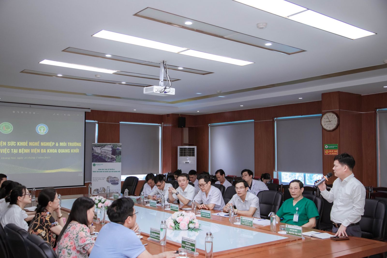 PGS.TS Nguyễn Minh Hiếu - Trưởng khoa Khám bệnh nghề nghiệp Bệnh viện Quang Khởi phát biểu tại buổi làm việc