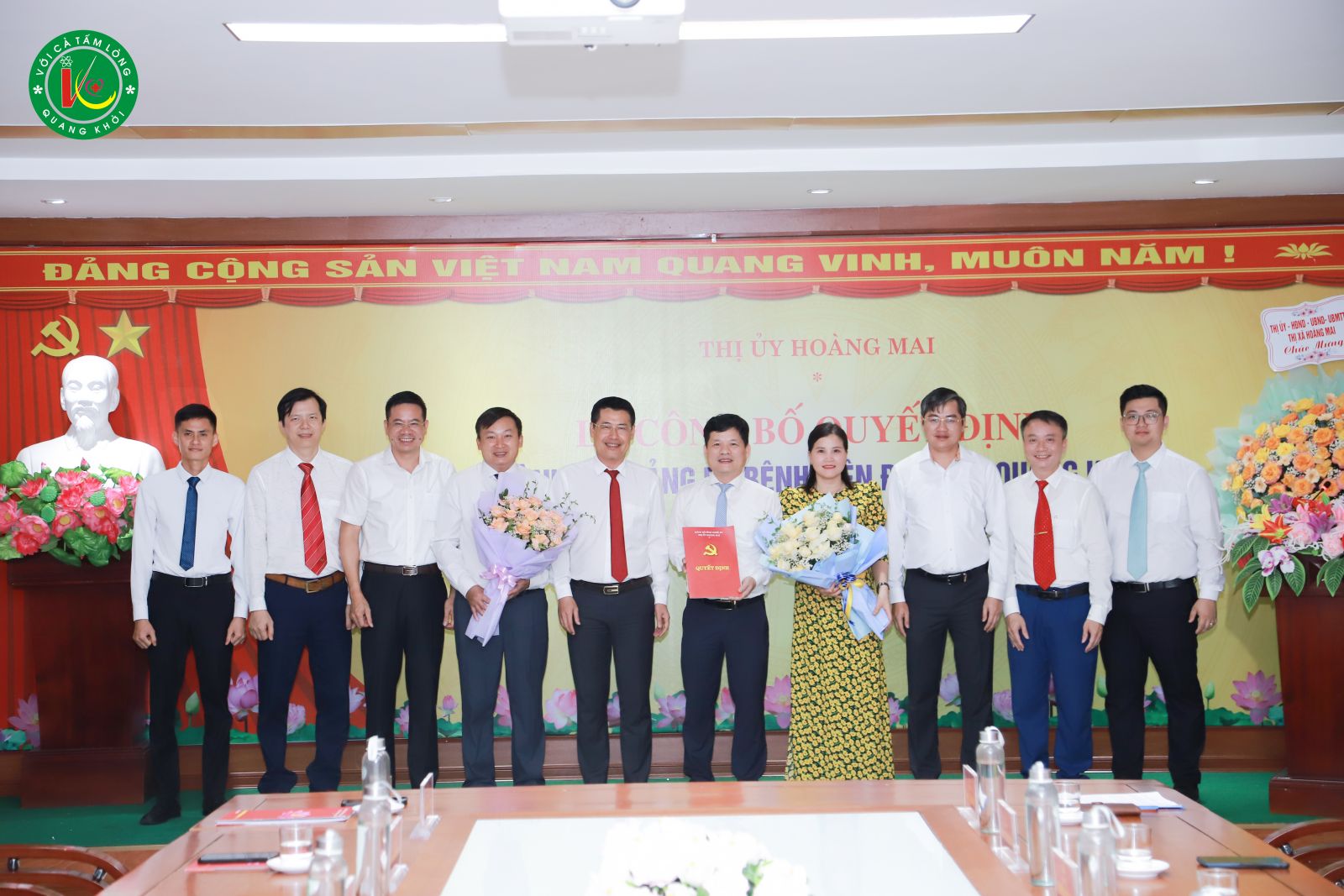 Lãnh đạo thị xã Hoàng Mai trao Quyết định và tặng hoa chúc mừng Đảng bộ Bệnh viện Đa khoa Quang Khởi